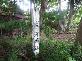| 本丸内部。ここは広くて草刈りもされているため、見通しがよい。 | 本丸にある八幡神社奥の宮の脇に立てられていた古い標柱。 |