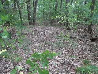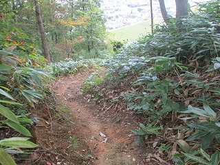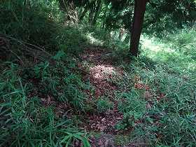 墓地の一番上から取り付いて行くと、すぐに削られた崖状斜面となる。これを直登することはできないが、そのまま南側に回り込んで行くと、端の方から上に登って行くことができる。