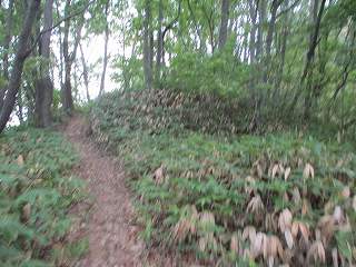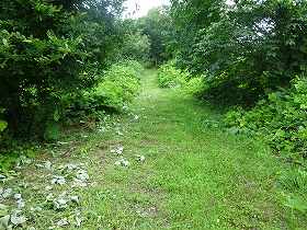 この道の途中に「土塁」という案内板が立てられている個所がある。確かにここにはちょっとした土塁があった。また、ここから二ノ丸にかけて、直線的な道が付けられていた。