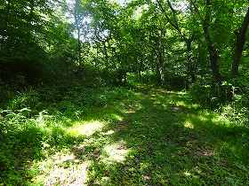 さらに進んでいくと、左側に土塁が見えている。この土塁の先はすでに二ノ丸の平場である。二ノ丸も南北に長く、150mほどの規模があり、かなり大きい。二ノ丸の先端部には馬頭観音堂が置かれていた。