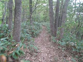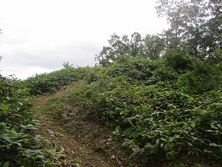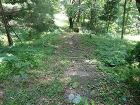 先ほどの「土塁」と書かれた案内板の所から、尾根伝いに二ノ丸に行くことができるので、それを通っていく。二ノ丸までは300mほどの距離があり、城域が実に広大であることが分かる。ところで、この通路も、途中の段郭の切岸を破壊してしまっているようである。