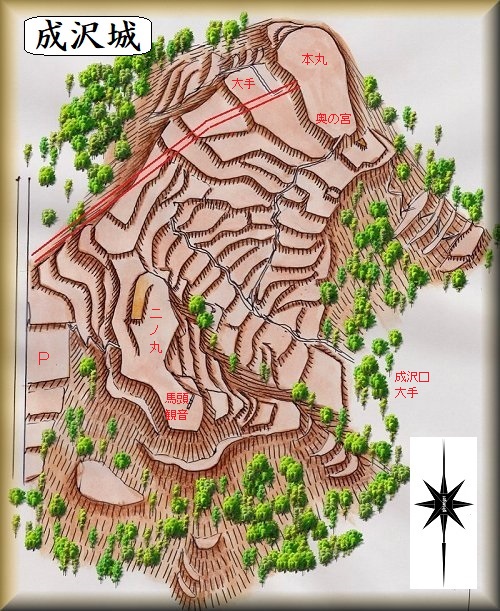 成沢城は、常善寺の東側にそびえる比高60mほどの台地に築かれている。かなり広い台地であるが、この台地の上から下までの間をほとんど用いて多数の曲輪を造成している。城は現在、成沢城址公園となっており、駐車場も完備している。駐車場にはパンフレットも置いてあり、ここに掲載されている案内図がとても参考になる。