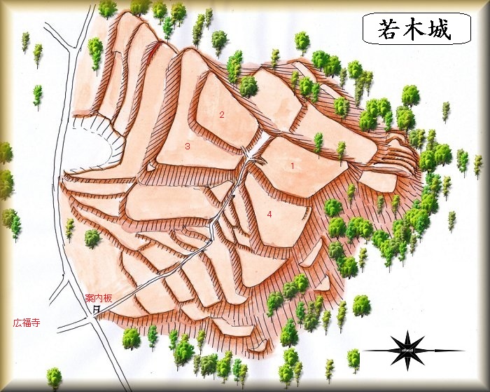 また、若木の集落の中に広福寺という立派な寺院があるので、これを目指して行ってもいい。道路を挟んで寺院の東側に城址はそびえている。