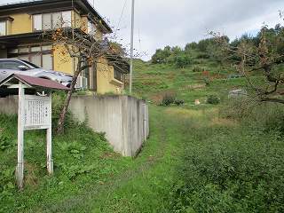 独立した台地であるので、近づいて行けばどこが城址であるのかはすぐに分かる。台地上は畑となっているようで登り口は何カ所かあるようだが、城の案内板は、南東のこの場所に立てられている。