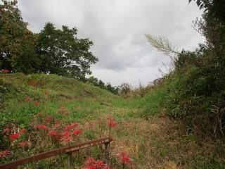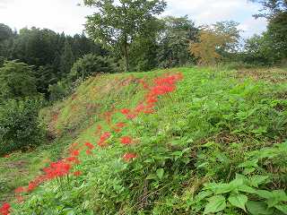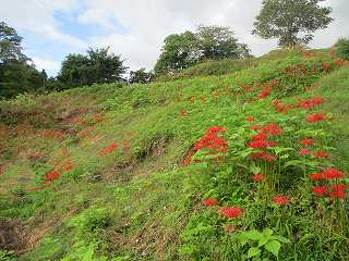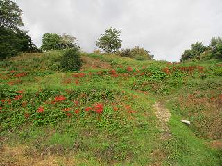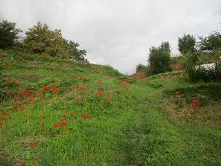 通路は中央部を通って行く。この城には赤い彼岸花が多数植わっていて、目を楽しませてくれる。自生しているものなのだろうか。こんなに彼岸花が咲き誇っている城址は初めてである。