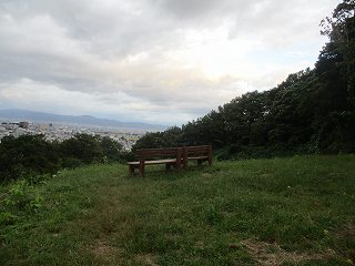 中腹まで登って行くと、ちょっとした平場があり、そこにベンチが置かれていた。見張り台と呼ばれている場所のようだが、山稜上の郭群からはかなり離れており、本当に見張り台だったのかどうかは分からない。