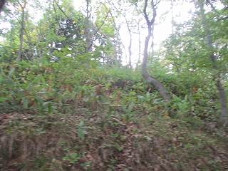| この尾根の先が二ノ丸。二ノ丸には石垣があるらしい。 | 本丸の虎口。 |