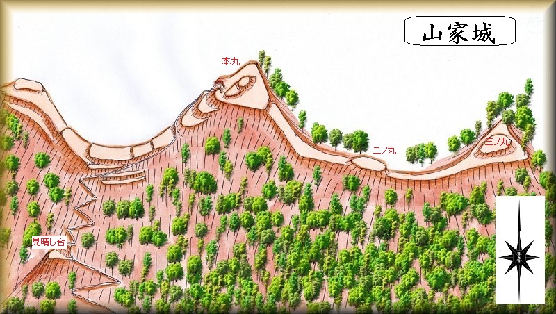 | 山家城は、南北朝時代に山家信彦によって築かれたと言われている。 この時期、北朝方の斯波兼頼が山形へ入部すると、南朝方であった山家氏は斯波氏と対立することになる。 後に、兼頼は娘を山家信彦に嫁がせて和議を取り計らったため、対立は回避された。 しかし、含むところはあったのだろう。兼頼の跡を継いだ直家は応永3年(1396)正月に、月見の宴にかこつけて山形城へ信彦を招き、宴の最中に毒酒を飲ませて信彦を殺害してしまった。 信彦と兼頼の女との間には家信という子がいたため、後に家信を養子に迎えて、山家一族を従属させた。 |