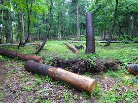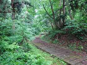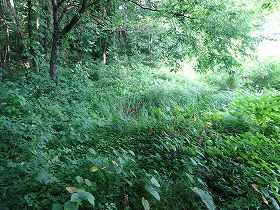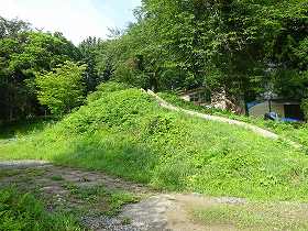 | 西側の土塁。 | 土塁上から見たところ。右側が城内、左側が城外の堀であるが、明らかに城内側の方が低くなっており、防御的には非常に心もとない構造である。 |