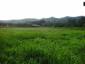 | 水田の奥にある案内板。 | 北東側の入り口脇には池状の方形の窪みがある。 |