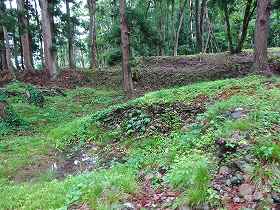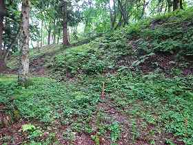 | 2郭西側の土塁。高さ7mほどもある。 | 2郭北西側の枡形。 |
