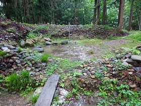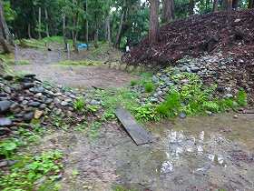 しかし、実際の所、それはどうであろうか。本来ちゃんとした石垣があり、それを取り払ったとしても、少しはそうした石が残されているのが普通である。そのような石が全く残されていないところからすると、どこまでちゃんとした石垣があったといえるのか。この城のほかの部分で石垣が使用されていないことからも、枡形だけにそれほど立派な石垣が構築されていたのかどうか、疑問に感じてしまうのである。