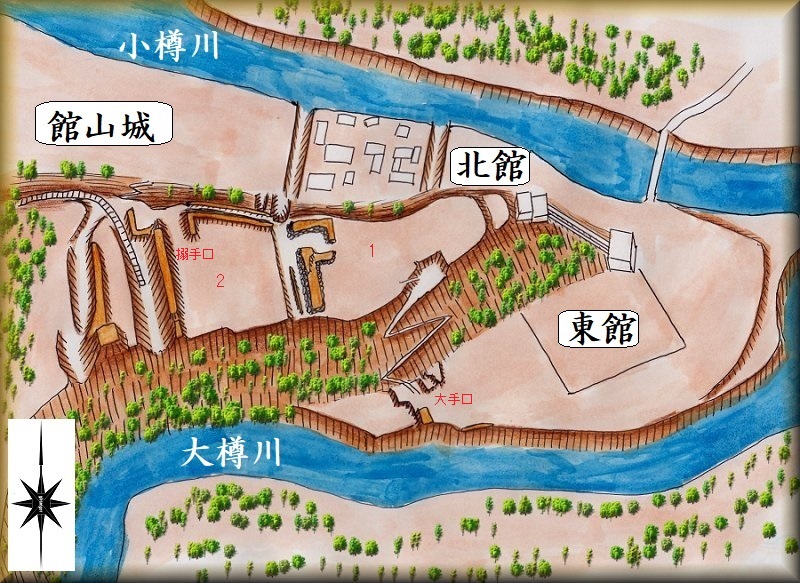 館山城は、小樽川と大樽川とが合流する地点にある比高40mほどの台地先端部に築かれていた。登城口は南側の大手口となっている。北側から橋を渡って案内表示にしたがって、東館の先を大きく回り込んでいくと、大手道が見えてくる。この図の南側が大手道であり、現在は大手口からしか登れなくなってしまっているということを念頭に置いておいた方がよい。