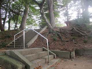 | 神社の入口。 | 北側の腰曲輪を上から見たところ。 |