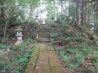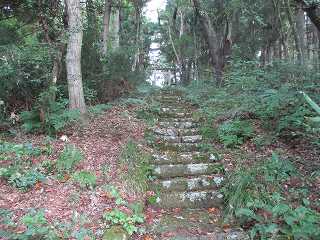 参道を進んで行くと、道は山稜に突き当たって南側に回り込んで行く。南端部分から石段が付けられている。