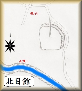 北目楯は、実恩寺の東側の集落の中にあり、現在は数軒の民家となっているが、北側と東側に堀の跡と思われるものが見られる。また、北側一帯に「楯ノ内」という地名が残っている。しかし残存状況はよいとは言えず、旧状は明らかではない。