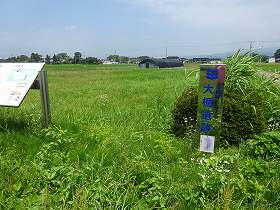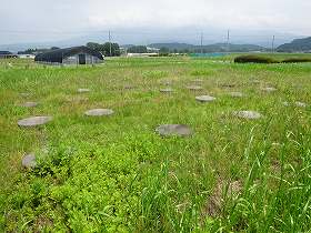 | 水田中に案内板と標柱が立てられている。 | 建物跡の柱位置が示されている。 |