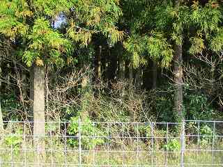 西側から城址方向を見る。こちら側からの比高は20mほど。 | しかし、一面に柵が張り巡らされており、近づけない。 |