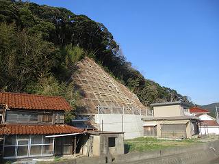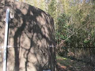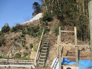 鰐坊山城。比高50mほどであるが、高さのわりには非常に険しい山稜である。斜面には崩落防止工事が施されている。 | 先端部にある水道タンクへの階段。この階段からしてすでに登るのが怖い。 |