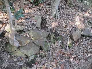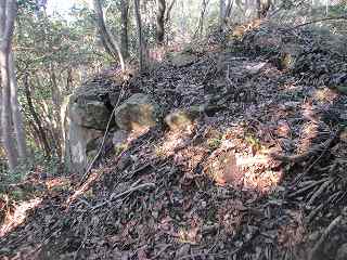 1郭城塁。 | 竪堀脇の土塁上に石積み。 |