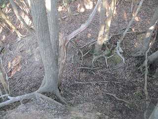 1郭の背後にも大堀切があった。こちらも5郭の岩盤堀切に匹敵するほどのデインジャラスなものである。注意しながら堀底に降りていく。