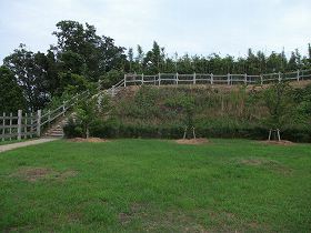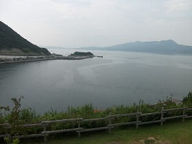 1郭から見た背後の大土塁。削り残しによるもののようだ。 | 先端の展望施設にから遠望した周防灘。 |