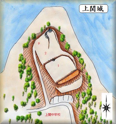 上関中学校のすぐ北側に隣接している比高30mほどの岬の先端部が上関城の跡で、現在、上関城山歴史公園となっている。