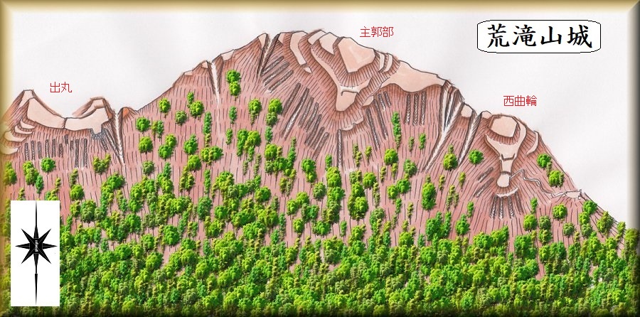 荒滝山城は、円通寺の西方にそびえる比高350mもある荒滝山に築かれていた。