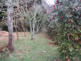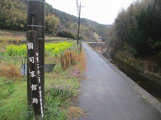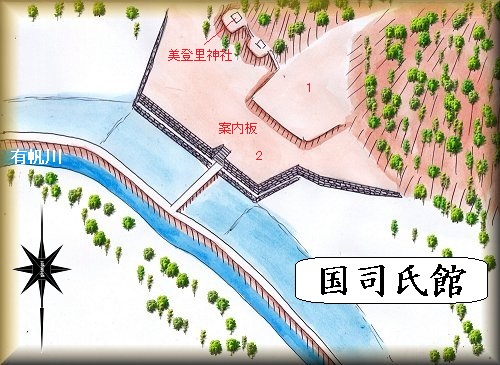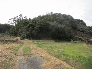 国司家館は、有帆川の北側に展開している山稜の山麓に位置している。西側を通っている県道沿いに、「国司家館跡』入口の案内表示が出ている。