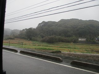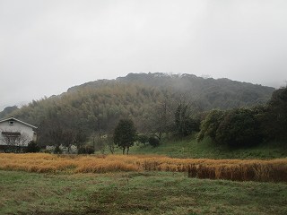 東側から遠望する吉見城。 | 城の周辺はこんな感じ。雨ではとても入り込めない。 |