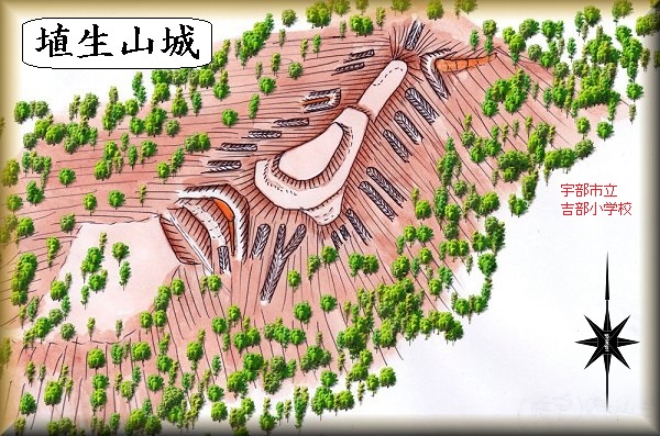 宇部市立吉山小学校の背後にそびえる比高70mほどの山稜が埴生山城の跡である。