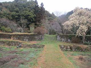 館の前まで行くと石垣造りの虎口が見えてくる。低いながらも石垣をしっかりと構築した館である。虎口を入ったところに案内板が立てられている。