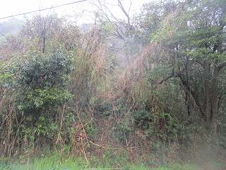 この日、土砂降りになってしまった。比高20mほどであるから、道さえあれば簡単に登れると思うのだが、城の周囲は密集したヤブになっている。これではとても入り込むことができない。