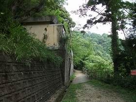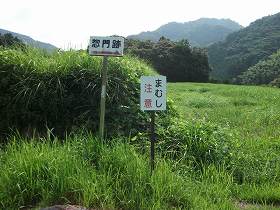 そのすぐ脇にある石垣。遺構なのかどうか、よく分からない。 | さらに進んでいくとこんな看板が・・・・。けっこう草が茂っていたので、今回はここまでにした。 |