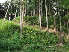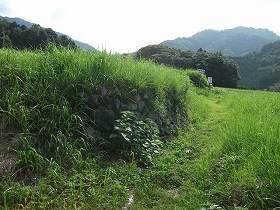 途中には段郭が何段にも連なっている。その途中の郭から見おろした山口市街。なかなかの眺望である。 | このような城塁と何段もの腰曲輪が続いていく。真夏の朝だというのに、けっこうここまで散歩してきている人がいる。 |
