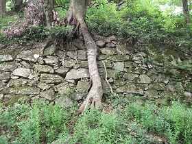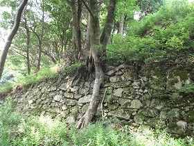 石垣はわりとしっかりとした積み方のものであるが、高さ3m以上積み上げるのは技術的に困難であったようで、だいたいこの高さに収まっている。さらに城塁の上の部分と下の部分に別々に石垣が積まれ、2段構造となっている。この時代はまだ高石垣を築き上げるだけの技術力には乏しかったのだろう。それでも戦国時代の石垣としては非常に見ごたえのあるものである。