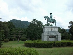 亀山公園の入り口。 | 公園内に建つ毛利敬親の銅像。奥にそびえて見えるのは高嶺城。 |
