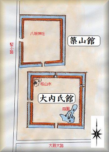 現在、山口市内には館跡と称されるものが南北に2箇所並んでいる。南側の大内氏館は龍福寺の境内となり、北側の築山館は、八坂神社の境内となっている。いずれも規模は150m四方ほどあったようである。