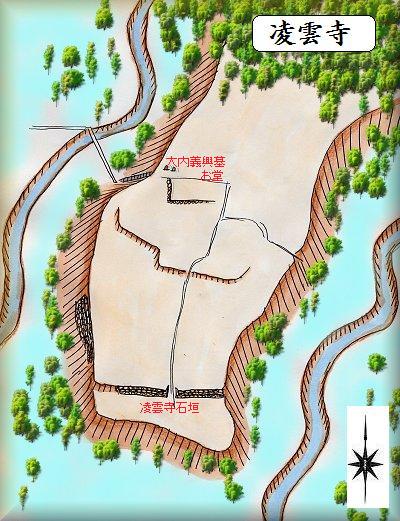 凌雲寺は、永正4年(1507)頃、大内氏30代の大内義興によって建立された寺院である。とはいえ、その立地する場所は、東西を川に挟まれた比高10mほどの台地であり、かなり要害性の高い地形上にある。ただの寺院ではなく、いざという時には城館として活用する予定であったことは自明であろう。場所は国道435号線から北東に1.4kmほど入っていった所にある。地図にもちゃんと掲載されているし、入り口には案内板もあるので、それほど迷うことはないと思う。しかし、ここに来るまでの道はかなり細く、ずいぶん奥まった所にあるのだろうと感じた。