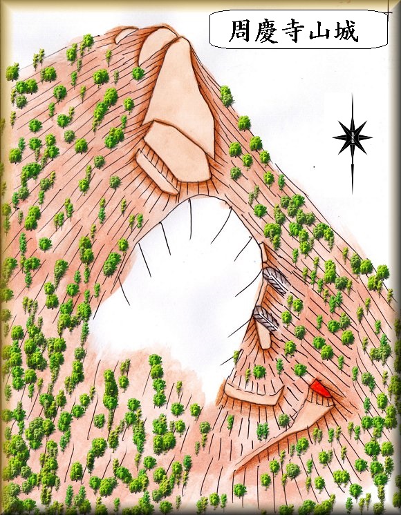 南岸にあり、標高250mの周慶寺山から北西に張り出す尾根の先端に位置する。
