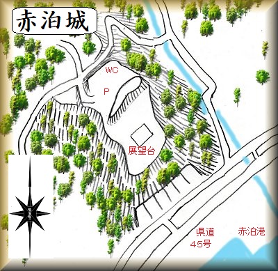 赤泊城は、赤泊港を見下ろす比高50mほどの山上にある。戦国時代末期に、羽茂本間対馬守高貞が、弟であった三河守高頼にこの地を与え、港支配のために築城させたのがこの城であるという。