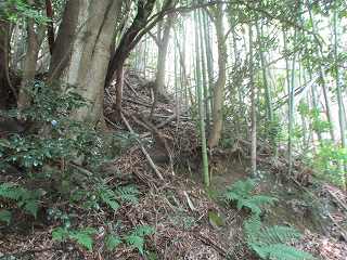 土塁の外側に空堀を穿っていないので、高くすることで防御性を高めたようだ。人工的に造ったものとしては少し巨大すぎる感もあるが、主郭と二郭を平坦にするために削った土をまとめて造ったものであろう。