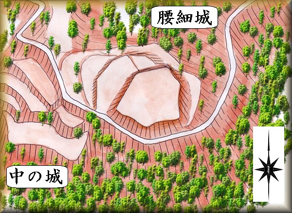 中の城の場所はここ。 腰細城の西側の中腹部分にあり、腰細城の付属施設か。