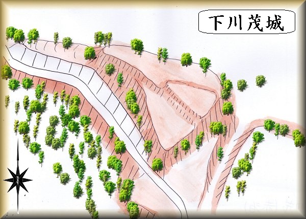 下川茂の比高60mほどの城山と呼ばれている山に築かれていた。川茂は地元では「かーも」と呼んでいる。