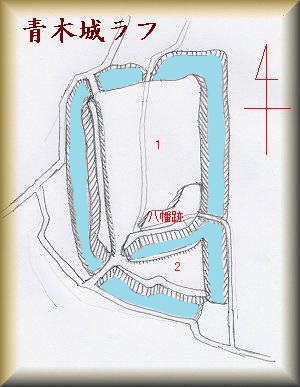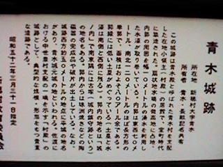 青木城については、城址に立っているこの説明板の通りである。新穂村に何カ所か残っている、「村殿」の館の1つであり、いまでも幅10mほどの水堀と土塁が旧態そのままに残っている。
