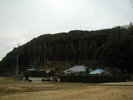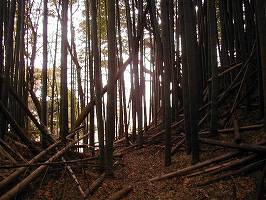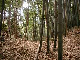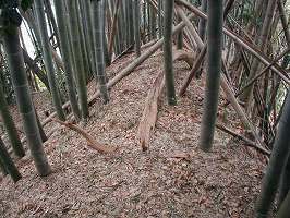 | 南側から見た荒海城主郭部。比高20mほどの台地上にある。写真中央の竹を切り開いているところが、3の腰曲輪である。 | 今回は(あ)の道から上がった。するとすぐに堀切1の所に出る。堀切は1郭側で高さ5m、幅10mほどである。 |