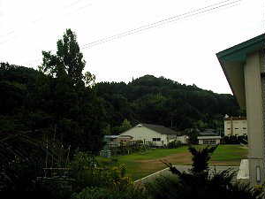 羽茂城を城山下の羽茂高校脇から遠望して見た所。南に延びてくる山稜の一部が、途中でくびれて先端部分が独立台地状になっているが、その部分の地形を利用して築かれている。