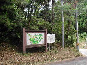 羽茂城址公園入口。図の(あ)の辺りで、看板の先の荒上城と、東の「北の城」、北側の山稜との間は切通しの道路となっている。これが堀切の名残でもあろう。