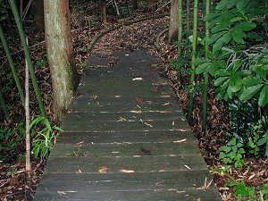 (い)の堀切。ほとんど埋まりかけているが、木橋が架かっている。