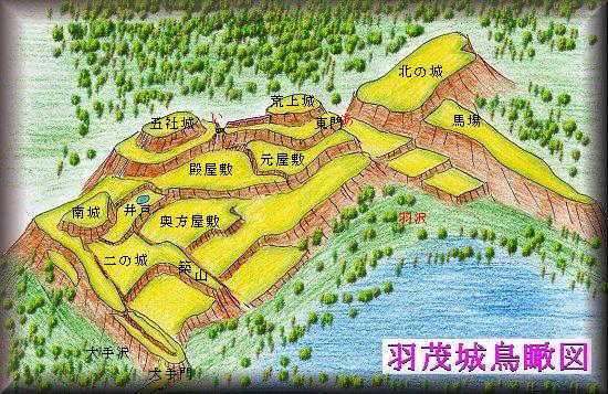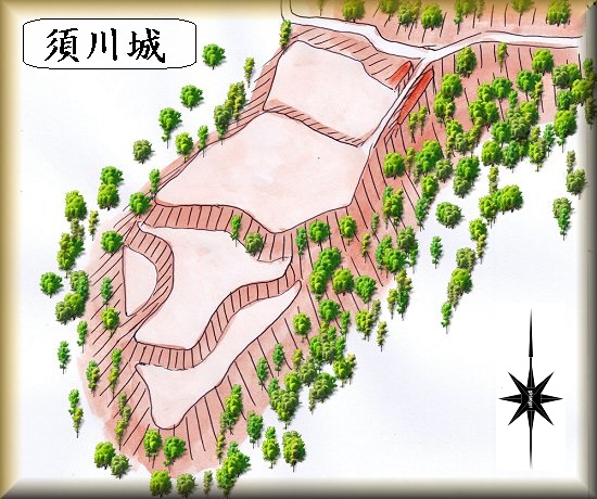 山頂から階段状に四郭が置かれ、土塁、空堀などが残るというが、ヤブがひどくて夏場では入り込めなかった。鳥瞰図は上記の書に頼り切ったものである。